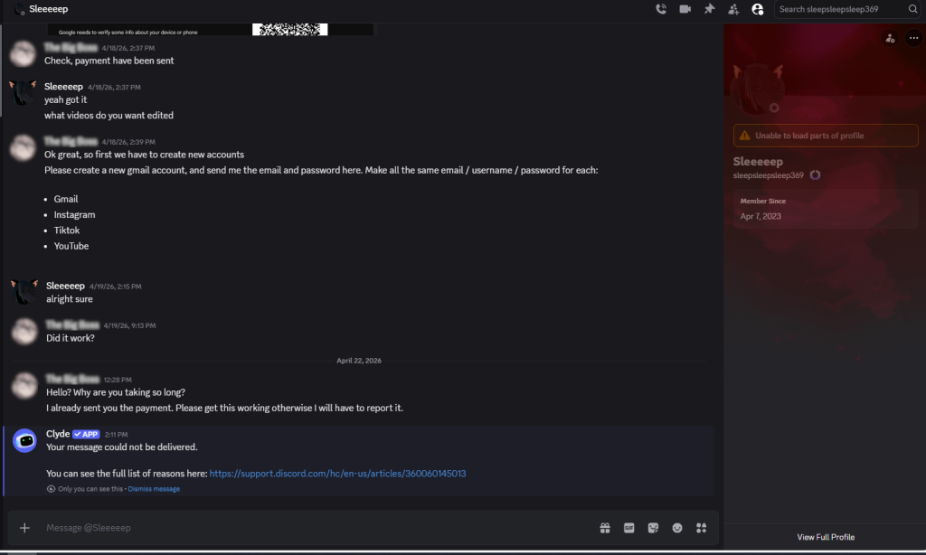 The user operating under the handle @sleepsleepsleep369 has been reported for engaging in fraudulent activity primarily within Discord job advertisement channels.
